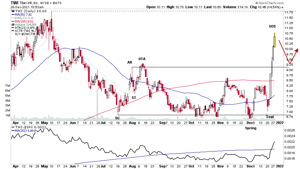 $TWI highlighted in the watchlist on the 22nd on the significant bar through the 200 day MA and into Phase D of the base structure, has moved very strongly since into a Sign of Strength (SOS) rally out of the base. So watching for potential a Backup (BU) towards the base.