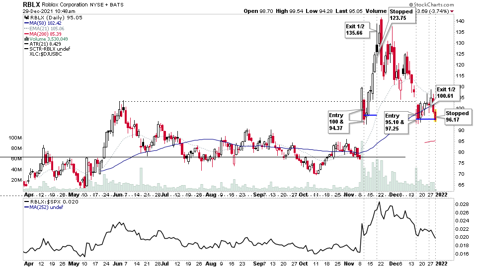 Was stopped on the final 1/2 position in $RBLX at 96.17 as it rolled over at the 50 day MA the last few days. So a small 0.29% account gain.