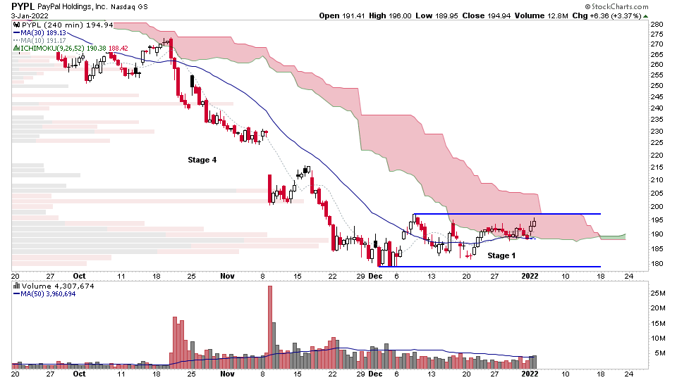 $PYPL coming back into focus on the intraday charts, as it makes a Stage 1 base on the 2 hour and 4 hour timeframes with diminishing supply, and getting near to the end of the resistance zone from the Stage 4 decline. So on watch for an intraday Stage 2 breakout attempt.