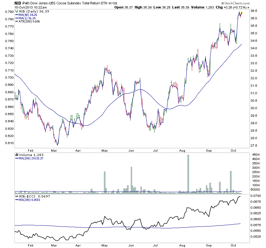We discussed Cocoa at the beginning of September http://stageanalysis.net/forum/showthrea...56#pid1556, as it was making it's first Stage 2 continuation move. Since then it's continued higher, and has made another minor continuation move this week. Relative performance is above the zero line and volume has been mostly above average in the NIB ETF since the Stage 2A breakout in August. So I thought this might a good to highlight at the moment, as it's not as correlated to the stock market moves.