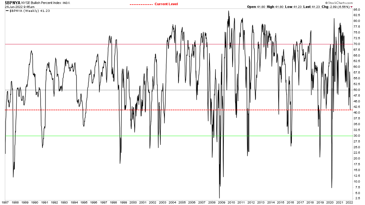 Nasdaq Composite Bullish Percent Index since 1996 is weaker than the NYSE. But also still shows that at previous major lows it has been a lot worse. Focus on risk, not on trying to catch a bottom.