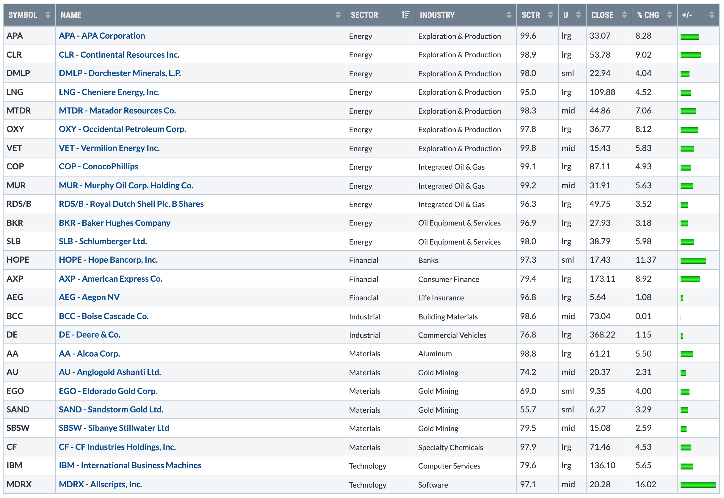 AA, AEG, APA, AU, AXP, BCC, BKR, CF, CLR, COP, DE, DMLP, EGO, HOPE, IBM, LNG, MDRX, MTDR, MUR, OXY, RDS/B, SAND, SBSW, SLB, VET,