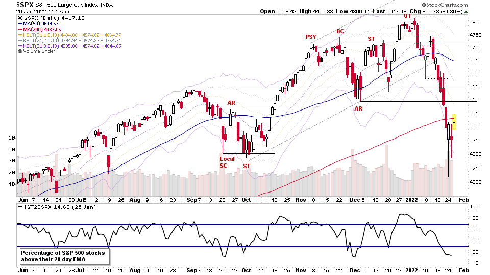 S&P 500 intraday range. Chance of a Phase C developing, with higher low, local spring.