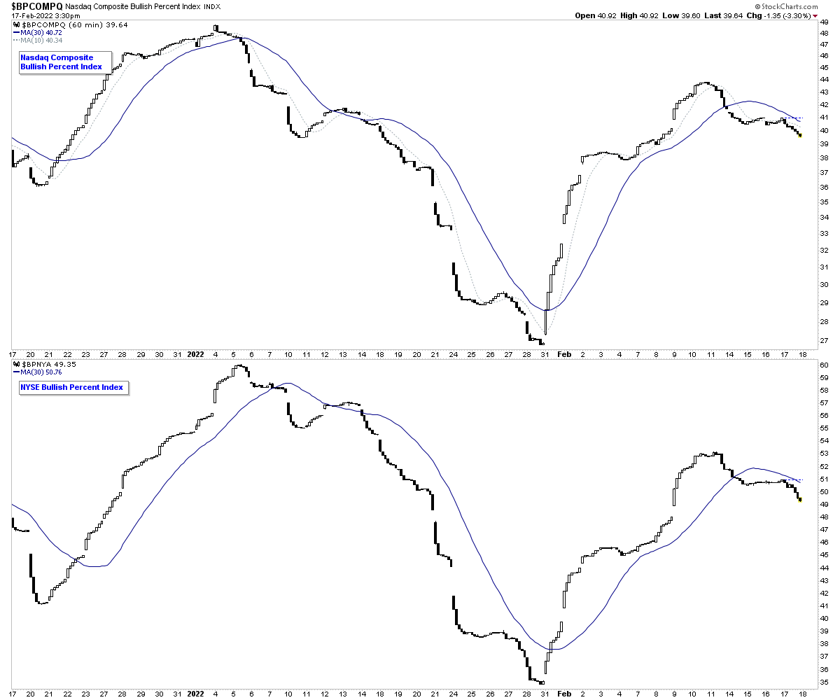 Nasdaq & NYSE Bullish Percent Index 1 hour chart couldn't recover the 30 bar MA level and continued to roll lower today below the MA. So has moved from neutral status to negative status today