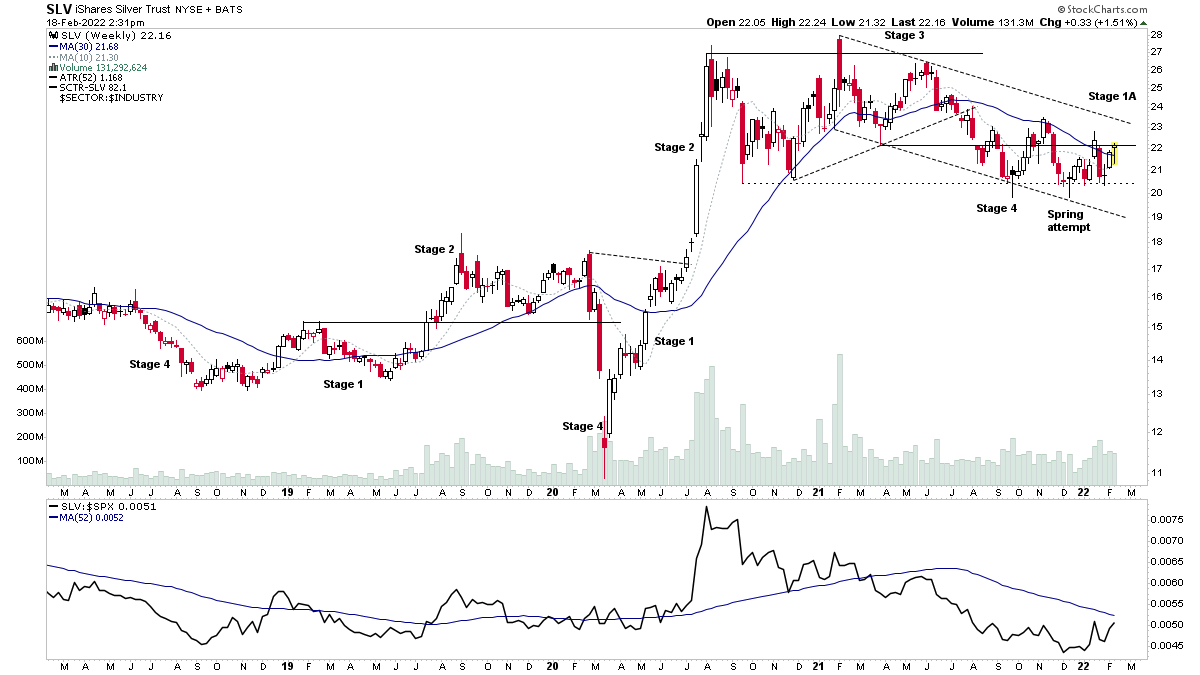 Silver is attempting to hold above the 30 week MA within the 1 year downtrend channel, so is still making an attempt to move into Stage 1. So would still only give it a fledgling Stage 1A rating. But if Gold breaks out into Stage 2, then Silver usually follows.