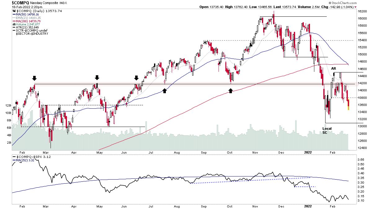 Nasdaq Composite dropping back into the lower half of the range today with continued uncertainty from world events. But technically it is still within the broader recent trading range in Phase B, so remains in the chop.