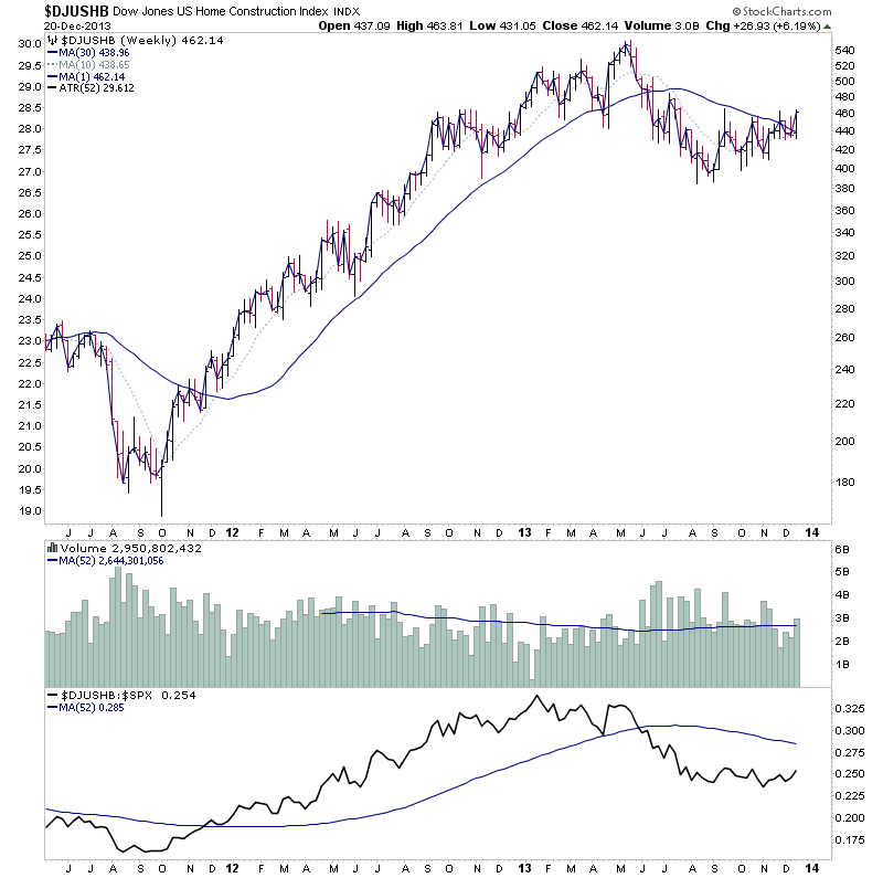A reemerging theme that I'm going to do some work on over Christmas is the Home Builders sector ($DJUSHB), which I think is at a crucial point on the monthly chart recovering above the 10 month MA from it's first significant pullback in the monthly Stage 2 run that made it a leading sector through 2012. The weekly is back into Stage 1 with lots of stocks attempting early breakouts http://stockcharts.com/freecharts/sector...TOR_DJUSHB so I think it's a theme that's worth researching again as the housing recovery has a long way to go yet imo.