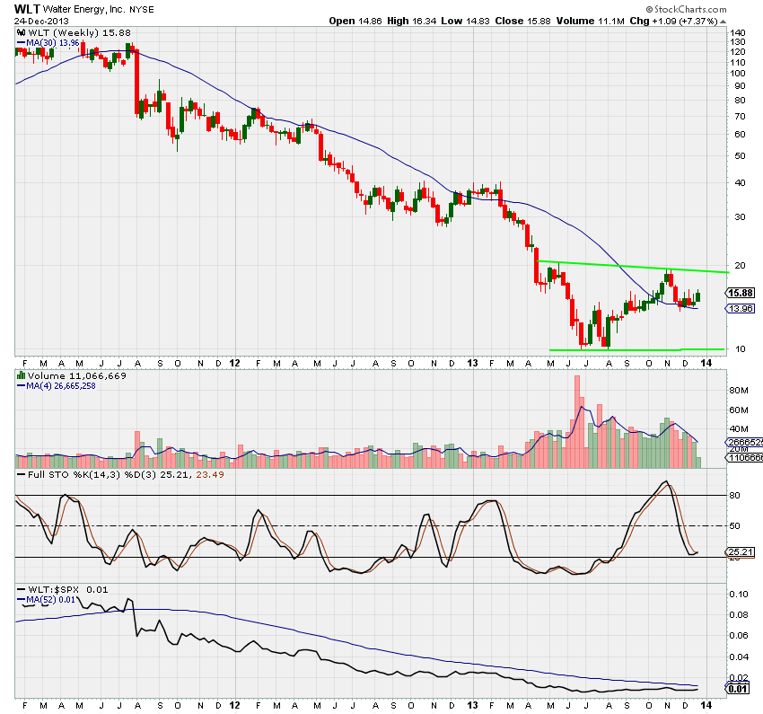 The first two are Stage 1 setups for the watchlist. Both are energy plays which is supposed to be a top performing sector for 2014: BTU and WTL. BTU was at $70 two years ago and is now trading around $18. I would like to see the 30 wma start turning up and a move into the $20 range with good volume as a potential Stage 2A move. Similar with WLT… trading at $130 two years ago and is down 90% to trade currently at $15. Looks like it may finally have found a bottom in the $10 range. Again, 30 wma turning upwards with good volume and move into the $20 range would be good signal for a move into Stage 2A.