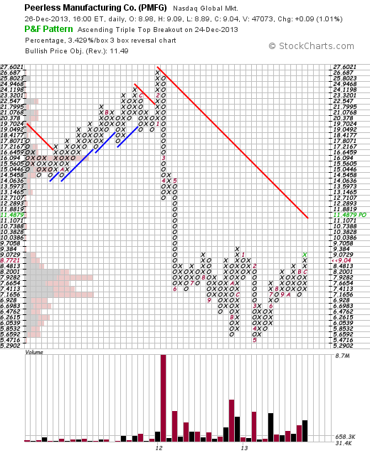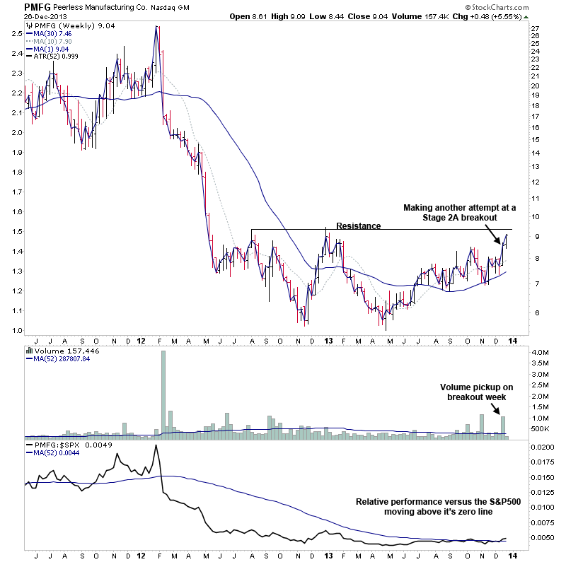 PMFG - Peerless Manufacturing made another attempt at a Stage 2A breakout last week on more than two times the average volume. Relative performance versus the S&P 500 is above it’s zero line, but it's still below the 9.42 high from the start of the year, but is within reach with it's move higher this week. And hence there's potential for a further breakout to new 52 week highs if it can clear that technical resistance. Attached are the charts.