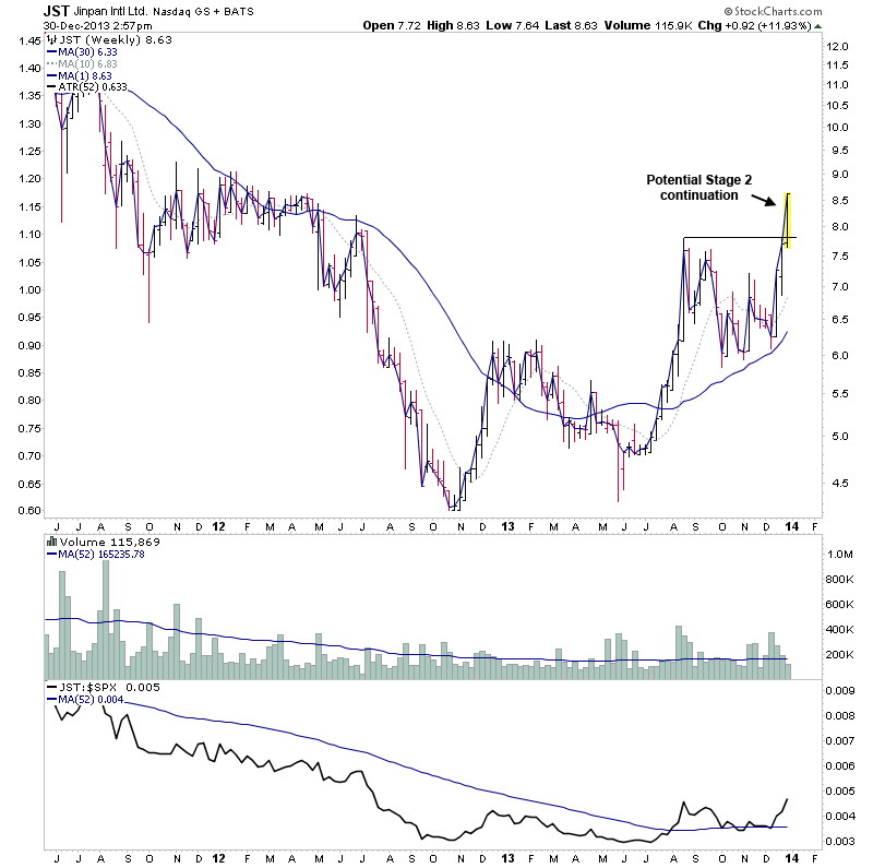 JST is attempting to make a Stage 2 continuation move on good volume today. Relative performance is strong and also JST is attempting a longer term monthly Stage 2A breakout also. Attached is the charts.