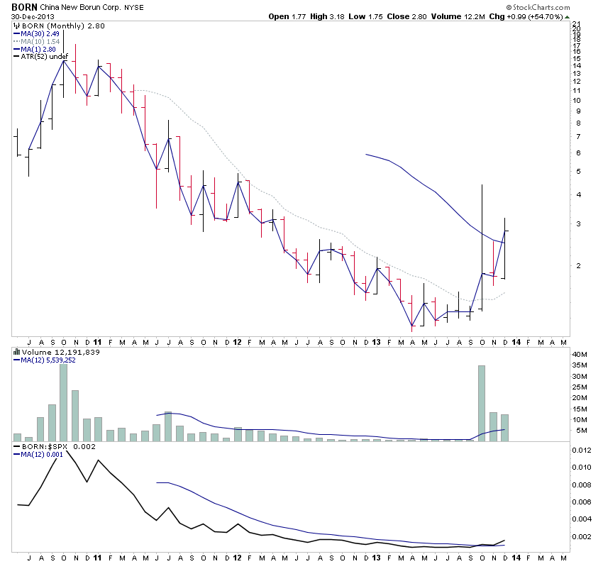 BORN - Potential Stage 2 continuation move with strong volume and relative performance versus the S&P 500. Strong volume pickup the last three months. Attached are the charts.