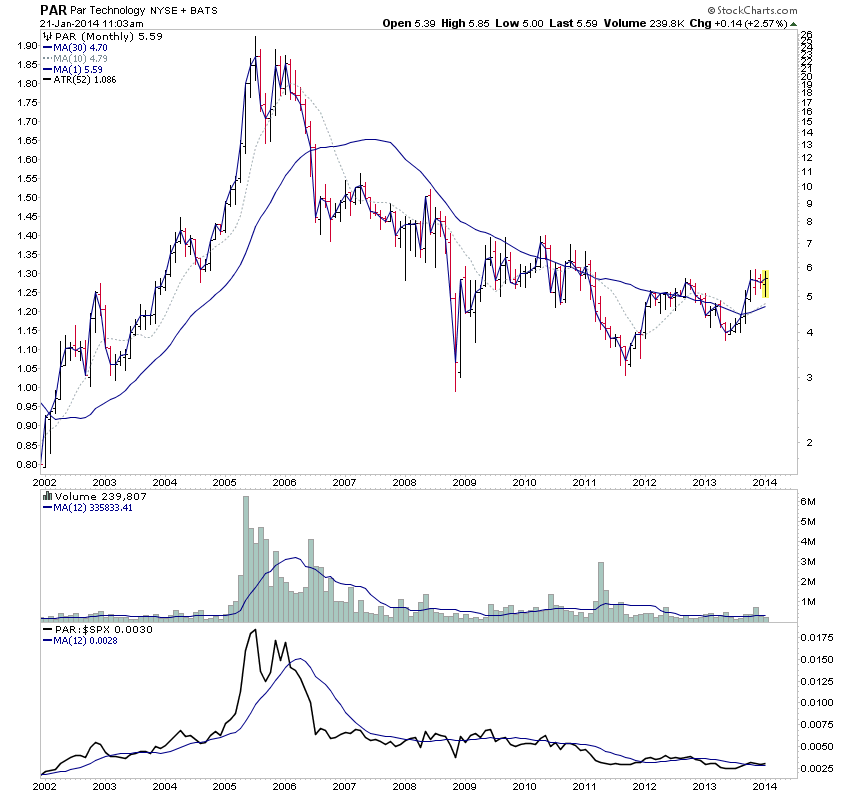 PAR is another interesting one today. Nice volume contraction during the recent pullback, and potential to breakout to new highs and monthly Stage 2A, weekly continuation move.
