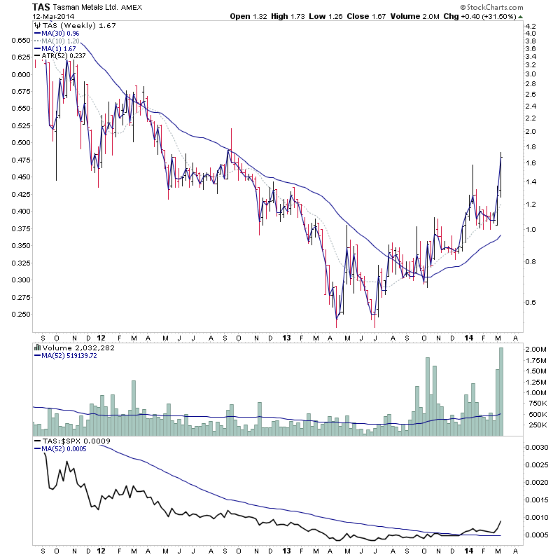 TAS - Tasman Metals is attempting to make an early Stage 2 continuation move on it's strongest volume for a long time.