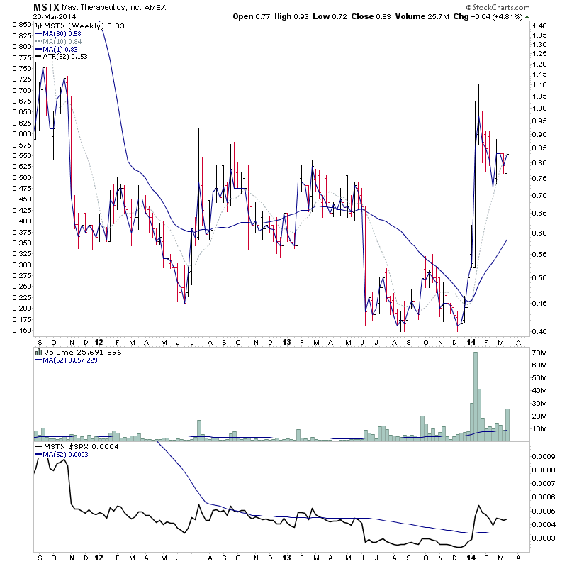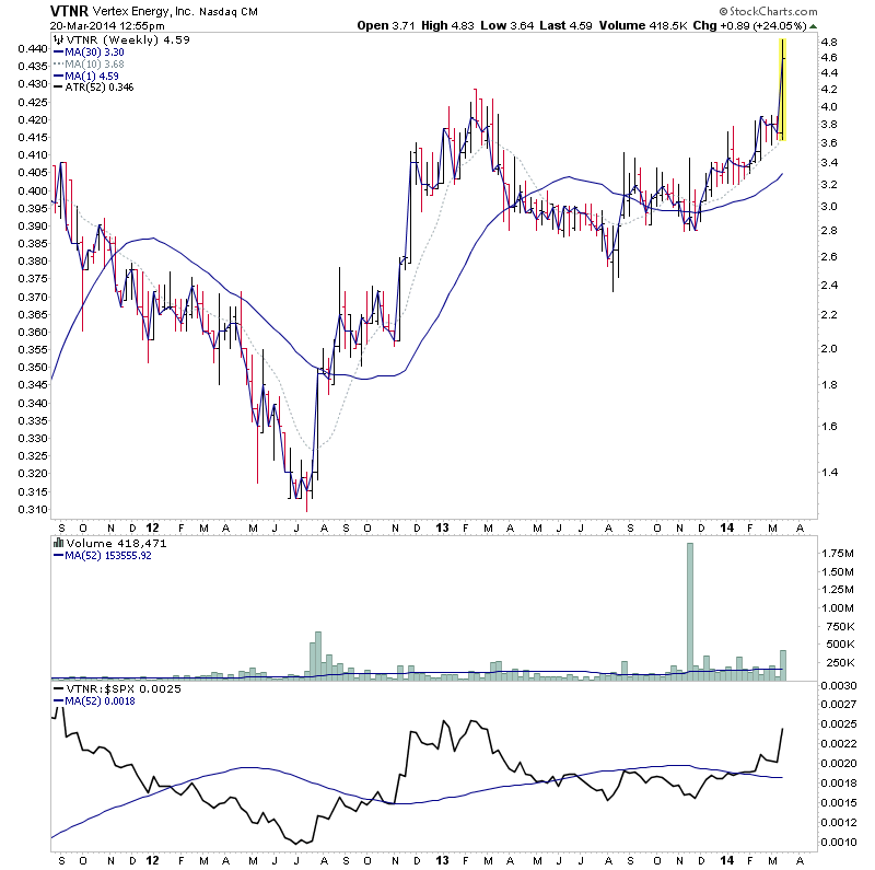 MNGA came up in the watchlist on the 14th when it was still in Stage 1 here: http://stageanalysis.net/forum/showthrea...28#pid3428, due to it's strong relative volume move following it's pullback to the 30 week MA, and has since had a massive volume spike, which has moved the price 128% in a week, and managed to close just above the Stage 2A breakout level for the first time.