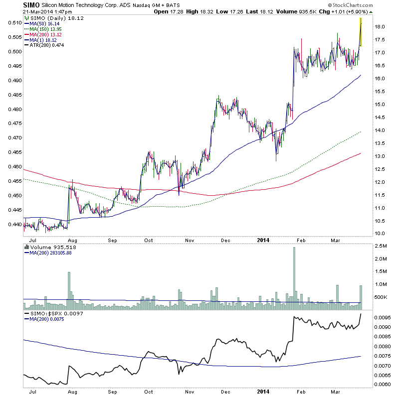 SIMO is attempting to make another Stage 2 continuation move to new 52wk highs today. A good volume increase today and strong relative performance. Attached is the weekly and daily charts