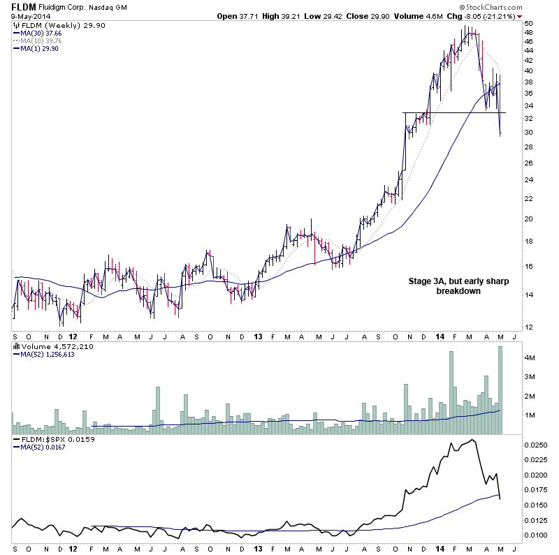 I'd say it's in early Stage 3A, but there's a chance it could make an early breakdown if it can close below the 200 day MA as it's had a big Stage 2 run up, but could have near term support down to the 11 area or so, and still has a strongly rising 200 day MA. So hence the only early Stage 3 rating.