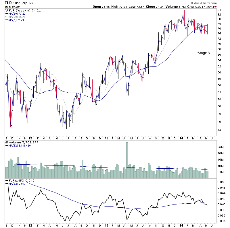 CSIQ - Stage 3, but attempting to break below the it's recent swing low which formed below the flattening 200 day MA, and so could make an early move into Stage 4A after it's huge Stage 2 run over the last year. Potential for a big drop if it breaks down, as has very little nearby support.