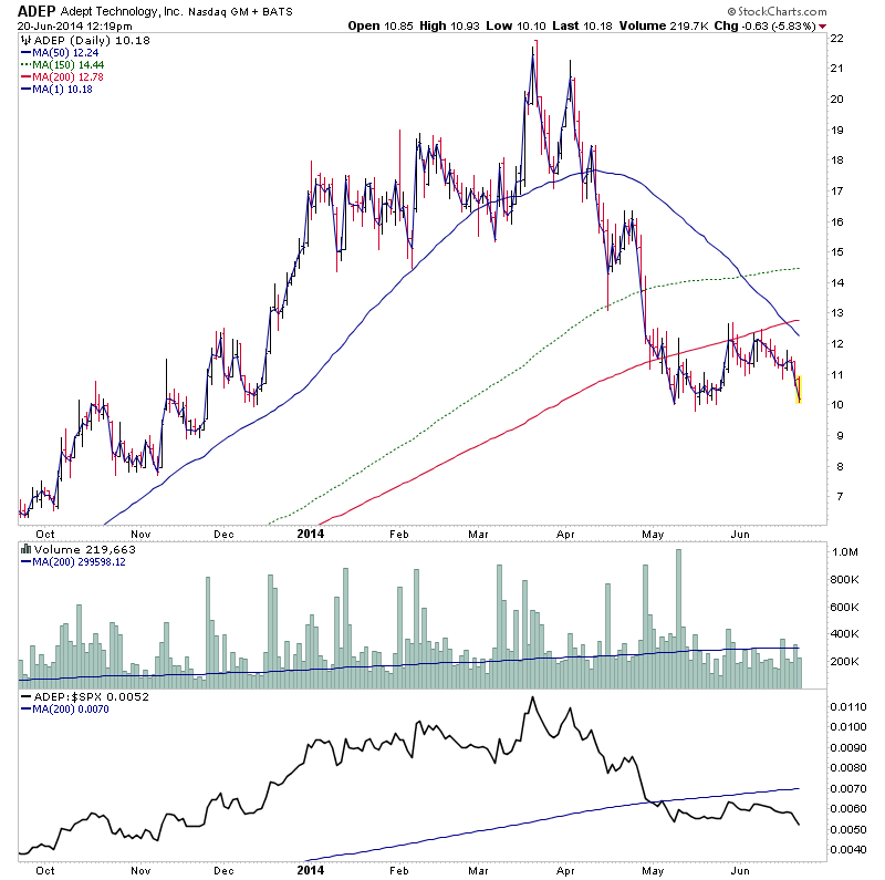 ADEP - a great trade for me earlier in the year, but is moving through the Stages and is now testing the swing low that formed below the 200 day MA in May and so could make a potential breakdown into early Stage 4A.