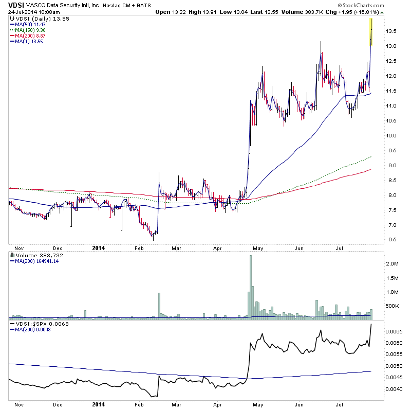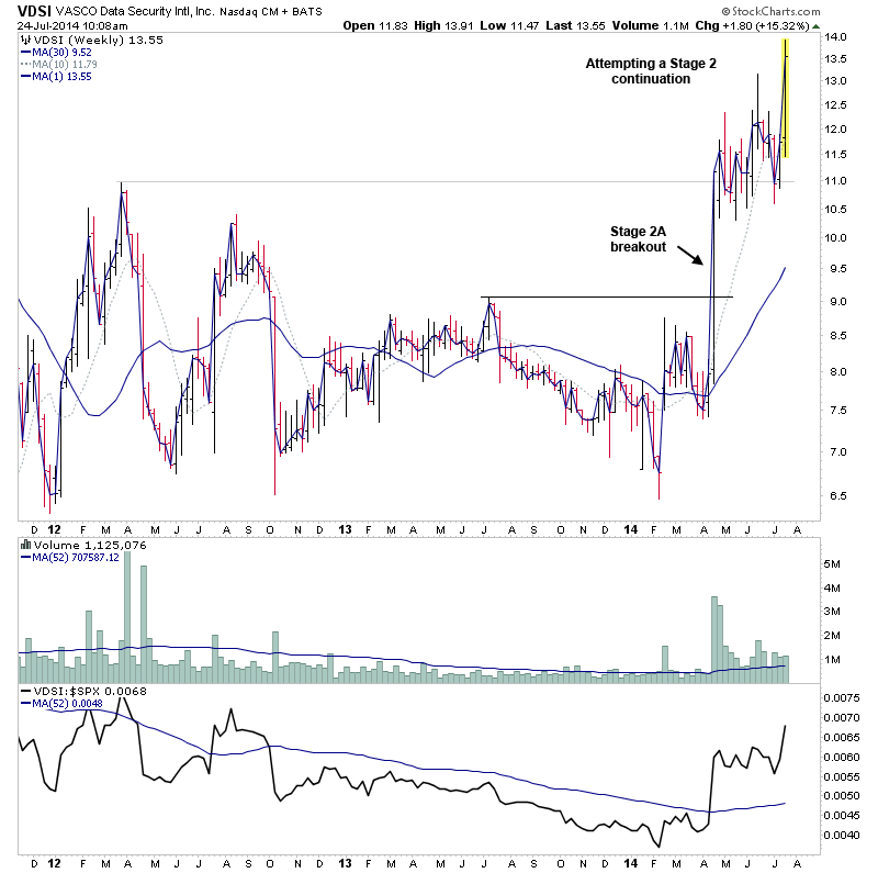 VDSI - last highlighted back in April when it made an explosive Stage 2A breakout on heavy volume. Since then it's consolidated higher around it's rising 10 week MA, and is now making a second attempt at a Stage 2 continuation move on more than the daily average volume so far today after only 30 mins or so of trading.