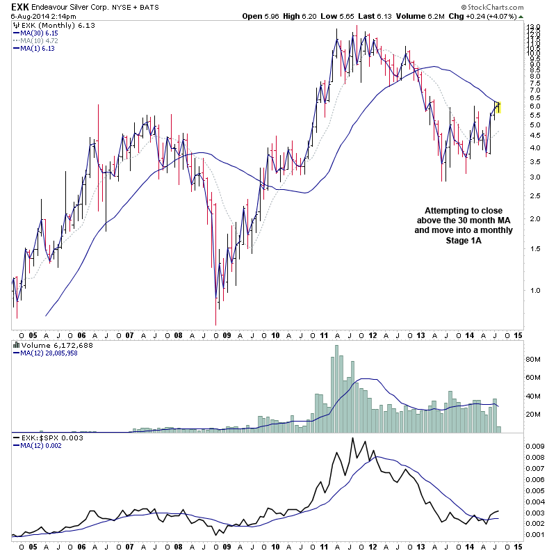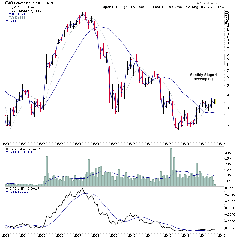 This one has had a severe Stage 4 decline in 2012-13 and so the monthly chart is still only in Stage 4B- and a fair distance from it's 30 month MA still, and so could still have some headwinds ahead if it breaks out, as there still could be a fair amount of the people that want to get out even left in.