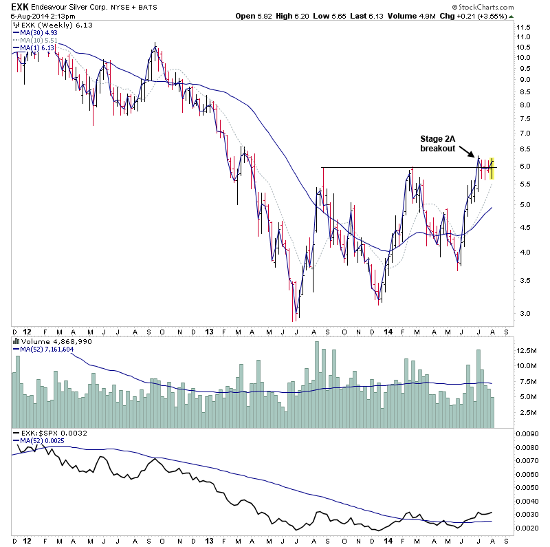 EXK - made a Stage 2 breakout four weeks ago, but has failed to go anywhere since and has been consolidating in a tight range around the breakout level. Pocket pivot today, so watch for a continuation.