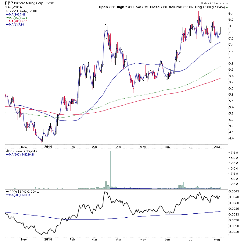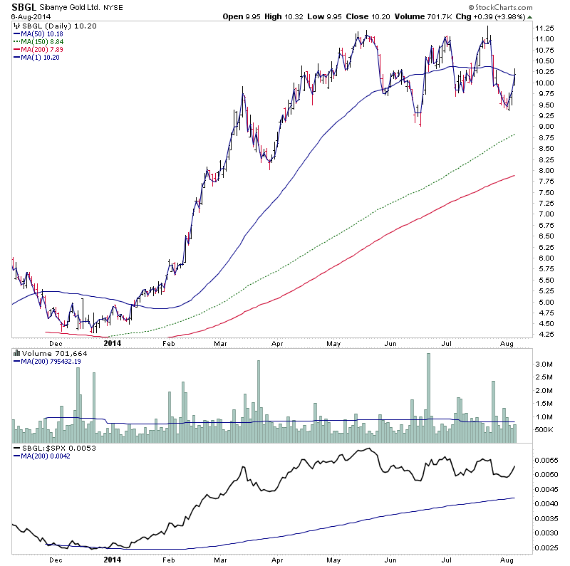 A few gold miners that have been on the watchlist for a while are SBGL and PPP, and with Gold still grinding out a Stage 1 base and coming into it's seasonally strong time of year due to the upcoming Indian Wedding season, it could be time to look at the precious metals miners again.