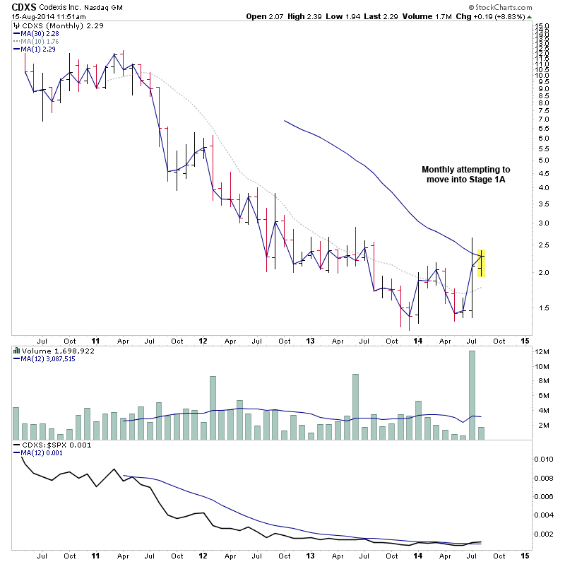 CDXS - This has been highlighted numerous times recently, but today it's attempting to breakout into Stage 2A, but the volume needs to double by the close of Friday’s trading to meet the week 2x average volume requirement. Monthly also attempting to move up a Stage into Stage 1A.
