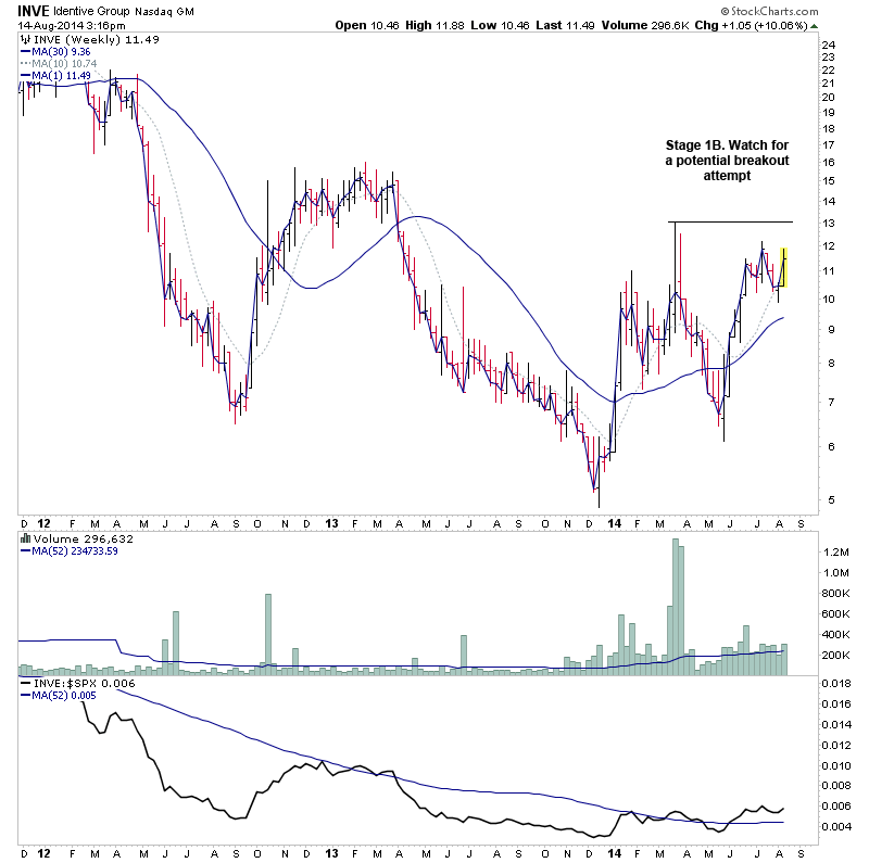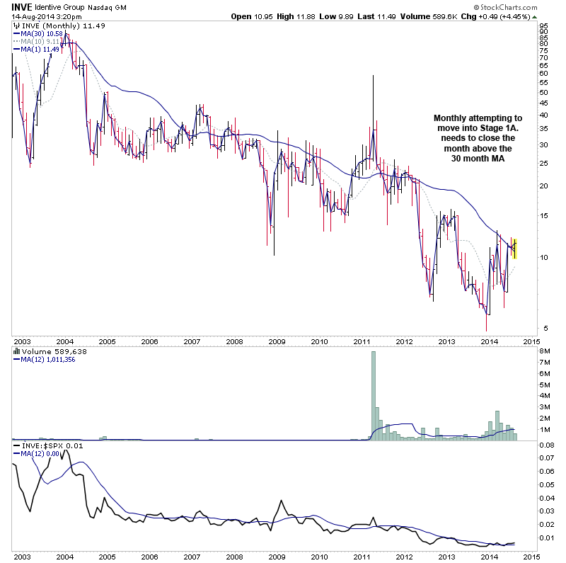 INVE - Stage 1B. Watching for a potential breakout attempt. Monthly attempting to move into Stage 1A. needs to close the month above the 30 month MA if it makes the weekly Stage 2A breakout.