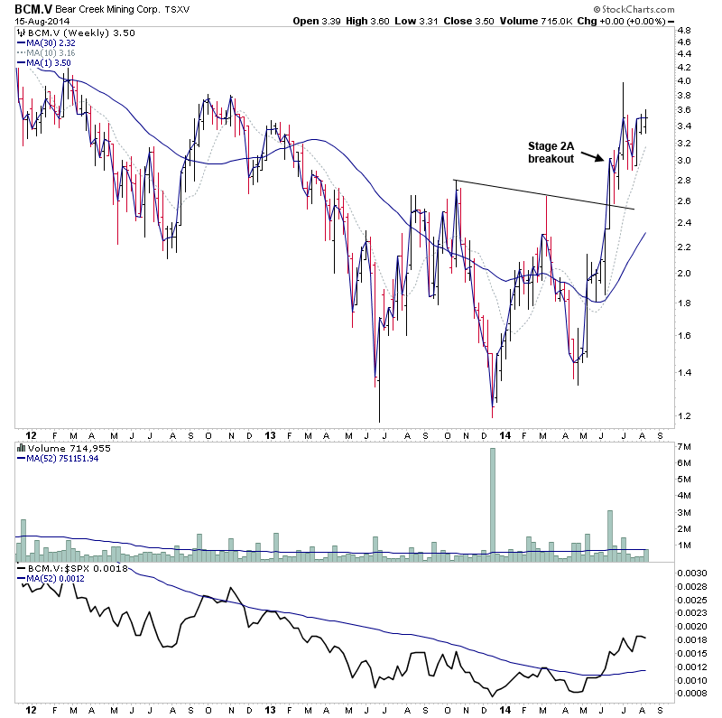 Hi jgalt, I've marked up the charts you mentioned with my opinion of their current Stages in order to help you learn the Stages, as I only have Bear Creek Mining (BCM.V) as being in early Stage 2, and the others are in different Stages. B2Gold (BTO.TO) has been in a very broad Stage 1 range for the last year. Goldcorp (G.TO) is in later part of Stage 1, which is called Stage 1B, and finally Tio Networks (TNC.V) broke out into Stage 2A in July 2013 and has had a strong Stage 2 advance since, and so would now be classed as just in Stage 2, possibly Stage 2B.