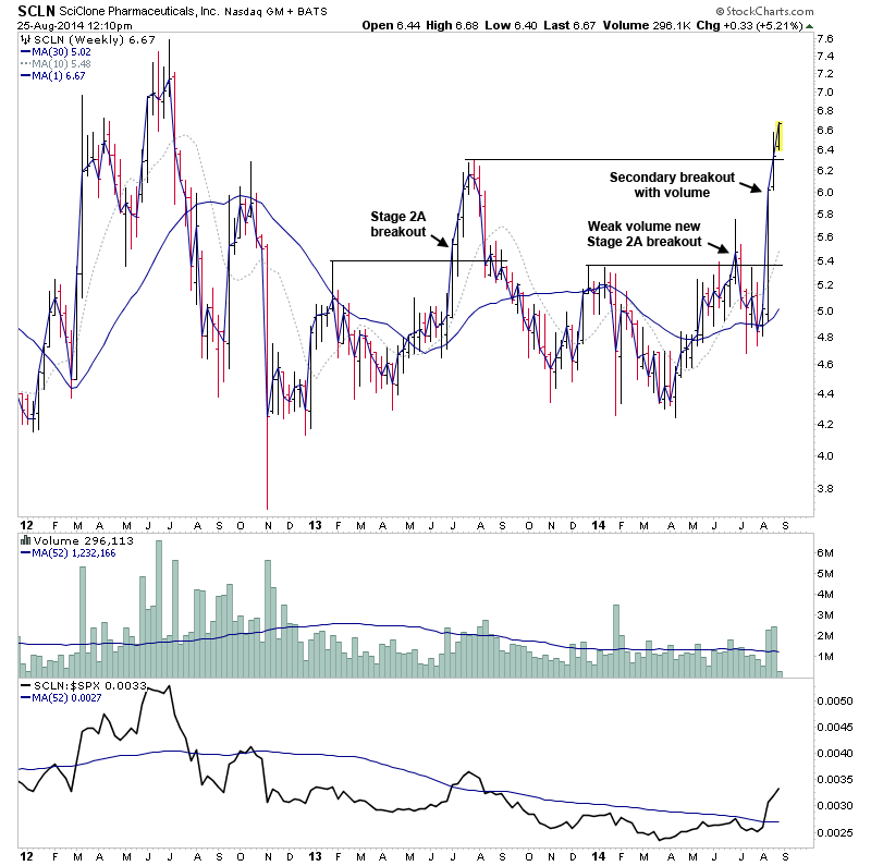 SCLN - attempted to breakout into Stage 2A in mid 2013, but the volume was weak on the breakout and the initial pullback didn't find support at the breakout level and continued down back into the Stage 1 base once more. In June this year it made a fresh Stage 2A breakout attempt, again on weak volume, and immediately pulled backed the following week, once again failing. However, two weeks ago it made a fresh attempt, this time with strong relative volume, and has continued higher in the following weeks to put in new 52 week highs, and so looks more promising this time.