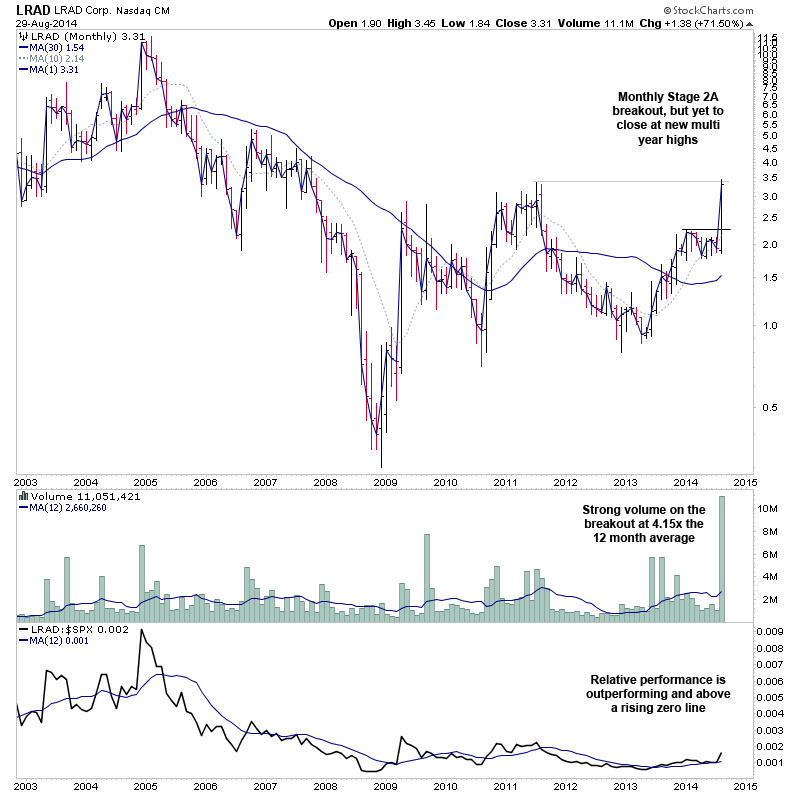 LRAD - Monthly Stage 2A breakout, but yet to close at new multi year highs, with strong volume on the breakout at 4.15x the 12 month average, and relative performance that is outperforming above a rising zero line.