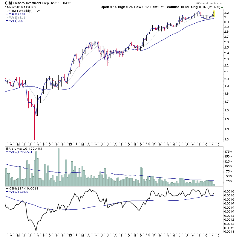 Here's the charts. Attempting to move into Stage 2A on the weekly above it's recent swing high. Still near term resistance from the 2013 highs, but strong relative performance above it's zero line.