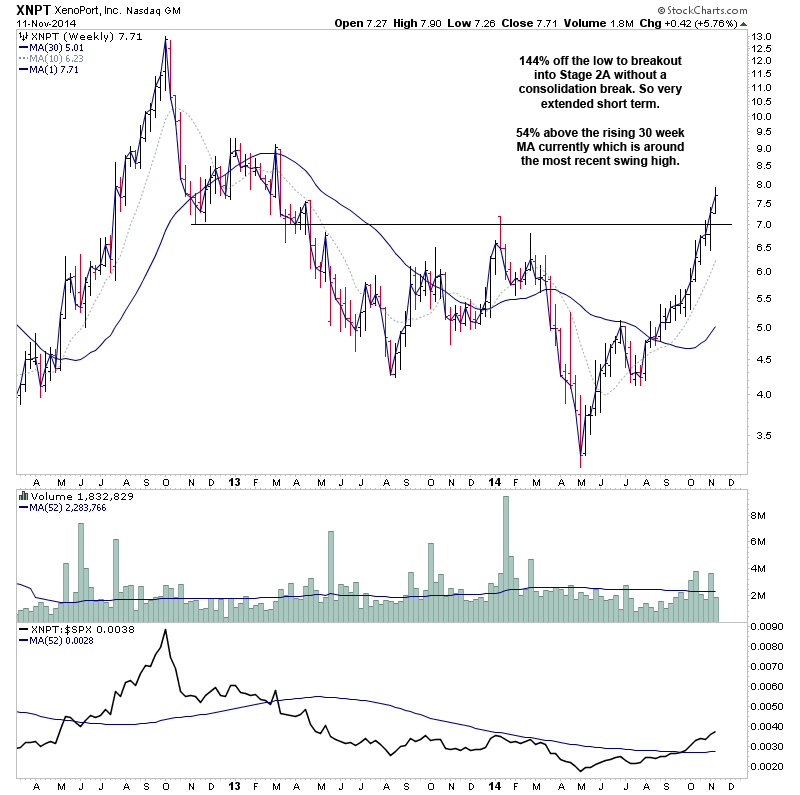 The chart reminds me of the stock I used in Quiz Question#1 in the Stage Analysis Study Guide thread which was a huge winner in 2013, but never the less, pulled all the way back to the 30 week MA following it's initial Stage 2A breakout as it was very extended short term like XNPT is. Here's the link: http://stageanalysis.net/forum/showthrea...12#pid3312