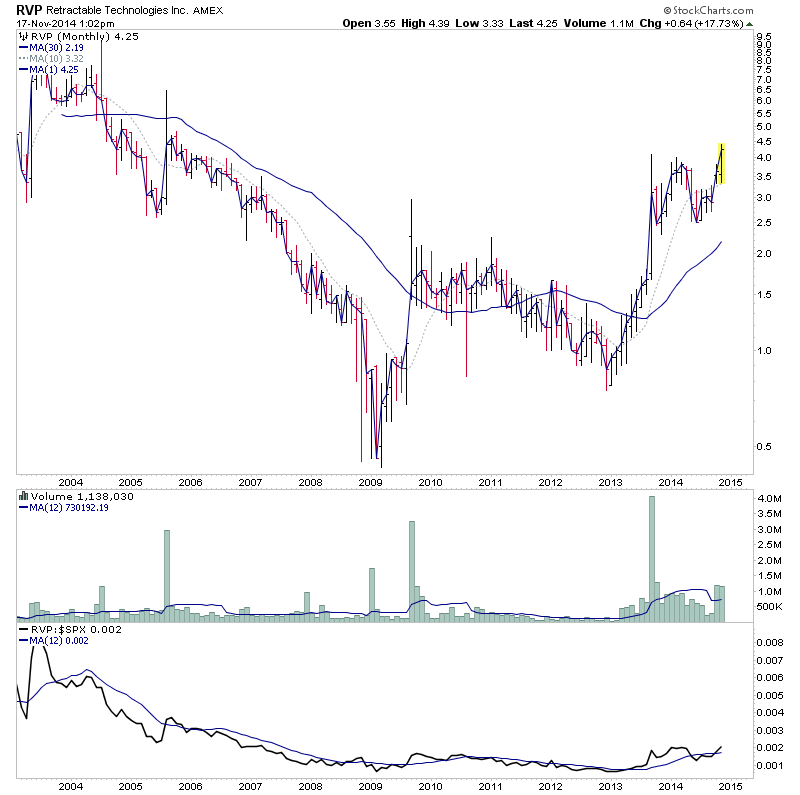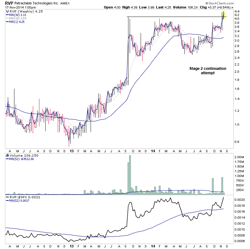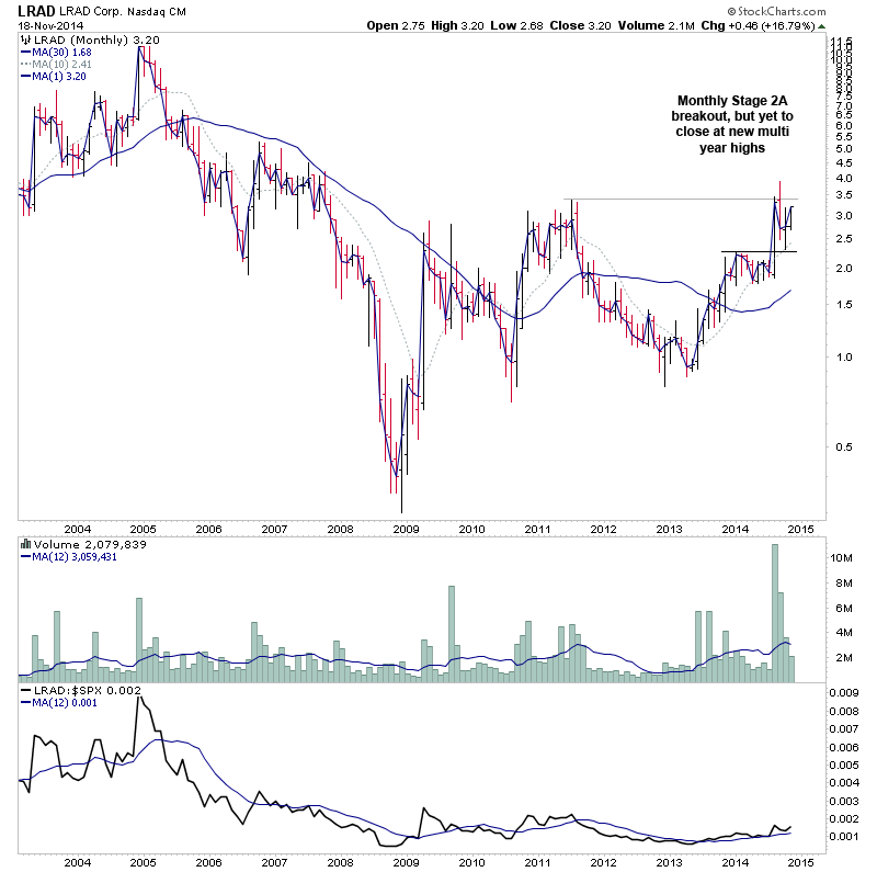 LRAD - Attempting to make a weekly Stage 2 continuation. The longer term monthly chart is still in early Stage 2A, but is yet to close at new multi year highs, but is very close once more. So with a P&F price objective of 9.63 (200%+) and very strong relative volume on the last up move. This one could have some legs in it if the continuation breakout is the real deal.