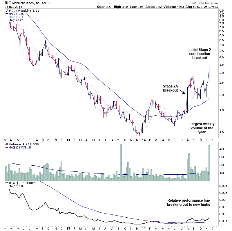 RIC - Stage 2 continuation breakout on strong relative volume. Highlighted earlier in the week on Monday 17th Nov in the Elite Board, and I bought into this one myself via the dual listed stock RIC.TO early on the 18th.