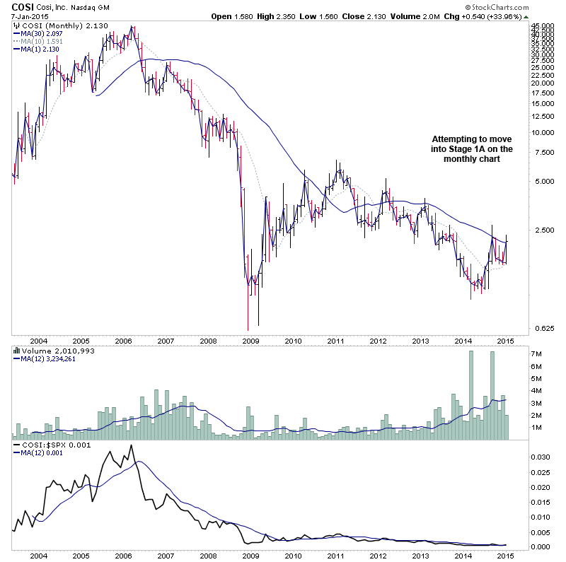 COSI - I last highlighted this one back in August as it moved into early Stage 1A, and since then it's formed a swing high and pulled back to the 30 week MA, where it held and has rebounded from again, and is now clear of the near term resistance zone shown by the ichimoku cloud on the weekly chart attached. It's continuing to form a raised Stage 1 range and the monthly chart is now attempting to clear it's 30 month MA and move into Stage 1A on the monthly. So it's looking more promising that it will make a Stage 2A breakout attempt during 2015, which if it does will be a good example of the kind of patience that you need when looking for a proper Stage 1 base to form, which ideally should be at least six months or greater on the weekly chart imo.