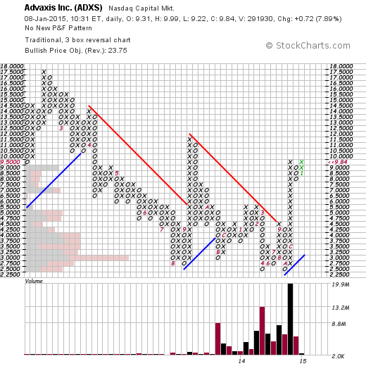 ADXS - last highlighted at 4.94 on the 17th Dec as broke out into Stage 2A, and it's moved almost 100% since then. I noted at the time that it still had heavy resistance to work through, which it's moved through strongly on heavy relative volume over the last three weeks. So it's now looking like a promising Stage Analysis candidate to watch to see how it acts on it's first significant pullback / consolidation for investors, although short term traders might be interested in the current small consolidation breakout attempt.