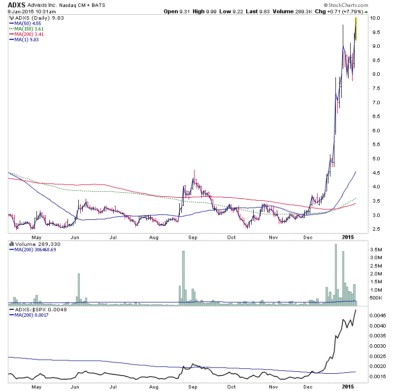 ADXS - last highlighted at 4.94 on the 17th Dec as broke out into Stage 2A, and it's moved almost 100% since then. I noted at the time that it still had heavy resistance to work through, which it's moved through strongly on heavy relative volume over the last three weeks. So it's now looking like a promising Stage Analysis candidate to watch to see how it acts on it's first significant pullback / consolidation for investors, although short term traders might be interested in the current small consolidation breakout attempt.
