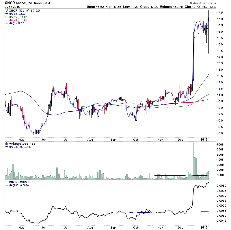 XNCR - consolidating in early Stage 2, near to new highs. Potential for a continuation breakout attempt.