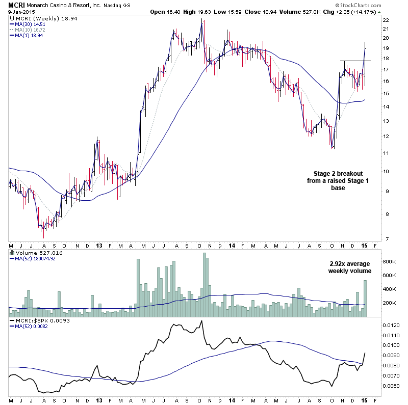 MCRI - Stage 2 breakout from a small raised Stage 1 base with 2.92x the average weekly volume and relative performance that's breaking above the zero line.