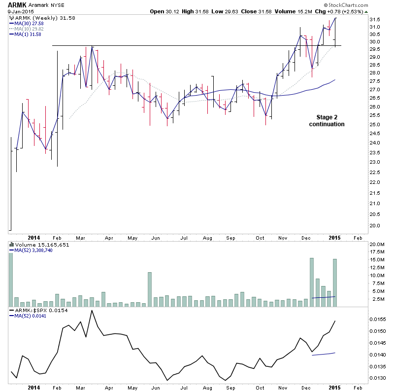 ARMK - Stage 2 continuation with strong relative volume. Moving to new highs