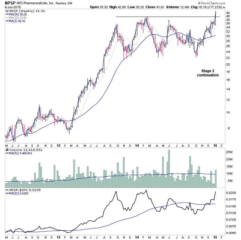 NPSP - Stage 2 continuation from a one year range with strong relative volume to close at new highs