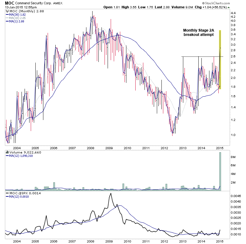 MOC - volatile micro cap from the AMEX attempting to move into Stage 2A on the weekly and monthly charts on a large volume increase.