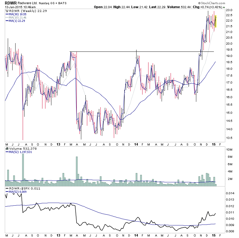 RDWR - originally highlighted on 13th Nov as it made it's breakout attempt to new highs. Has consolidated around the 10 week MA over the last month and showing potential for a continuation move.