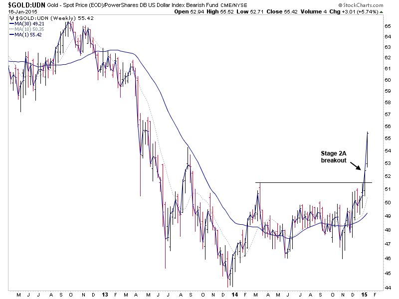 Fate does not always let you fix the tuition fee. She delivers the educational wallop and presents her own bill - Reminiscences of a Stock Operator. RE: Investor Method WatchlistAs noted in the Stan Weinstein Stage Analysis thread here: http://stageanalysis.net/forum/showthrea...09#pid6509, Gold has broken out to new 52 week highs in multiple major currencies around the world excluding the USD, and moved into Stage 2A last week and followed through strongly this week. So for most traders outside the US, gold is in early Stage 2A - See attached below: