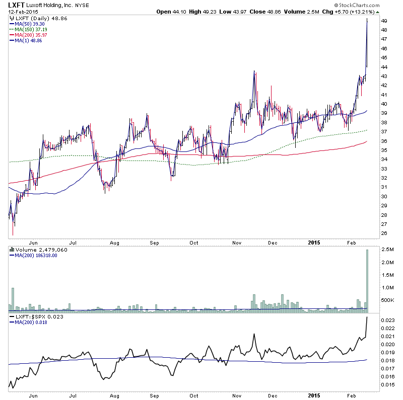 LXFT - Stage 2 breakout attempt from the primary base with heavy relative volume - 3.8x the weekly average. It was highlighted back in November, and then again in January, and has finally made the move to new highs today.