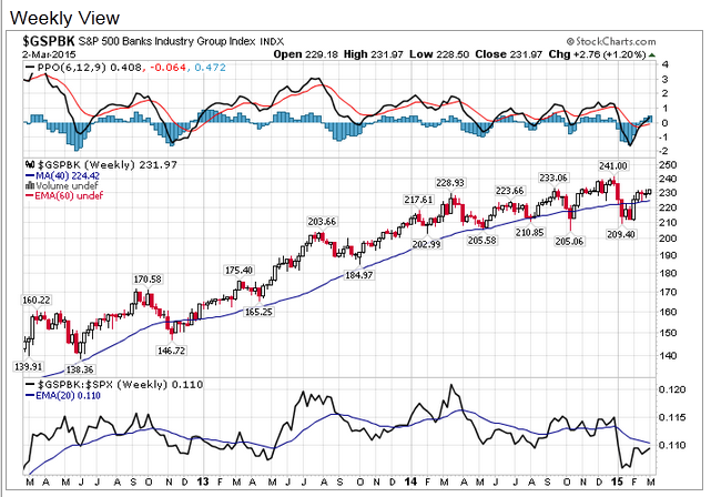 Left price chart of bank sector index, right RS of bank sector vs SPXEWI