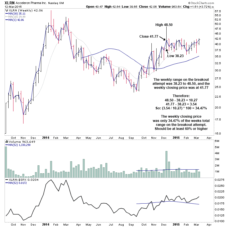 XLRN technically made an early Stage 2A breakout attempt back in December, but it didn't meet all of the breakout requirements. Note the weak close on the weekly bar of the breakout attempt week, which needs to be in the upper third of the bar at the close of the week for a confirmed Stage 2A breakout imo, as a strong weekly close is required.