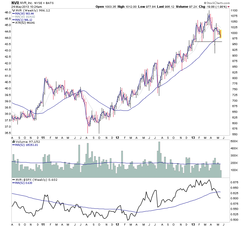 I had a look through the list of early breakdowns today in the NYSE, and NVR and BAP caught my attention for potential trader method candidates in the near future. Both are making potential head and shoulders Stage 3 tops with relative performance breakdowns below the zero line in the last month. Price has rolled over below a declining 10 week MA on both, but the 30 week MA is still rising, and they are both above their 200 day MA still and have also have price support close below still. So I'd put both in Stage 3/3B as any breakdown into Stage 4A would be an early one, and hence why I think they would more suitable for the trader method currently.