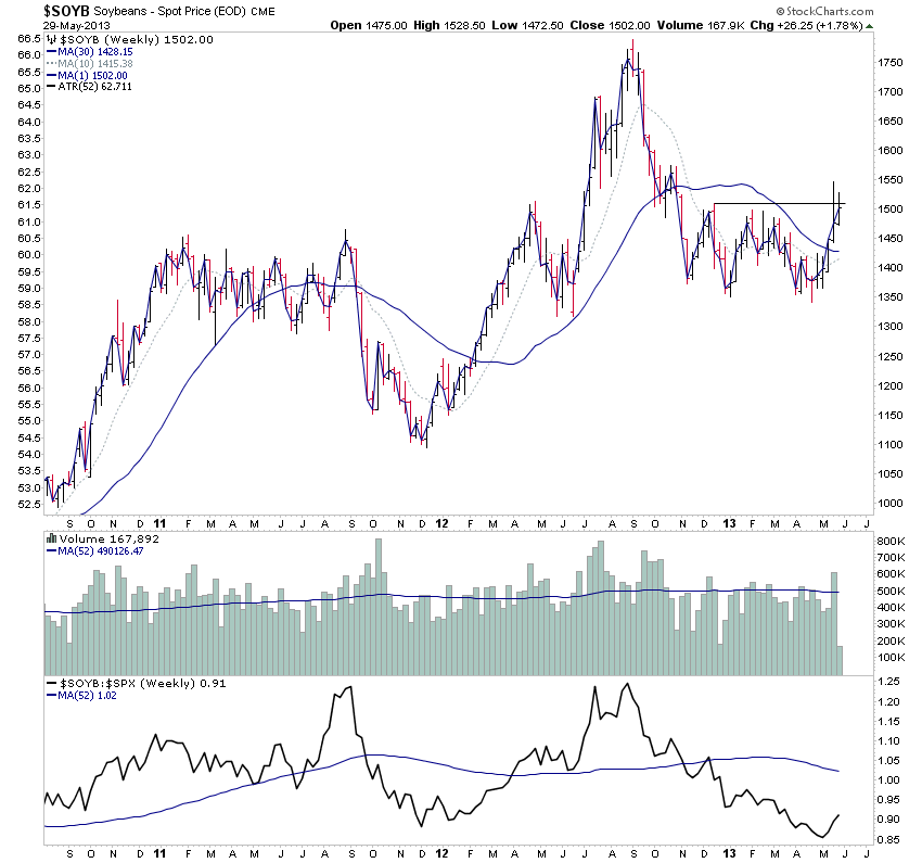 Soybeans is starting to look interesting again, after basing for the last 7 months or so. Currently it's attempting to make a weekly close above the 200 day MA and the Stage 1 range. So I'd put it as being in Stage 1B imo. Attached is the daily and weekly charts.